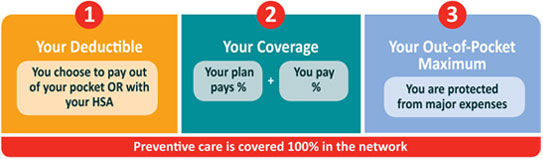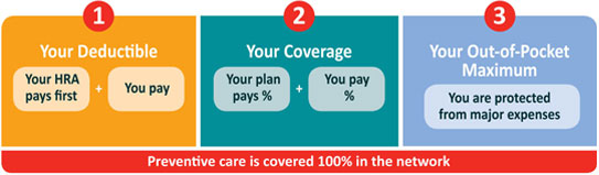 When you have an eligible expense, like a doctor visit, the entire cost of the visit will apply to your deductible. The HRA will pay for all of your eligible expenses first, as long as there is money in the account. This means you won’t have to pay anything until the HRA is depleted. Then, you will need to pay the full cost of your health care expenses until the remaining deductible is met. Medical and prescription drug expenses count toward your deductible.