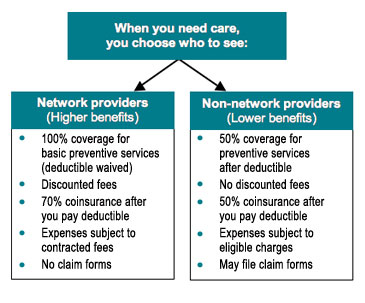• After you meet your deductible, the plan pays 70% of your eligible medical care expenses when you use network providers, and 50% for non-network providers.